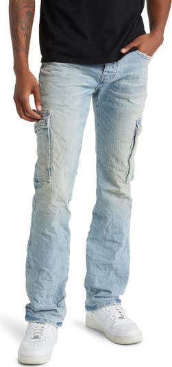 A beat-up look puts a sweet spin on laid-back cargo jeans shaped from stretch denim cut in a bootcut silhouette.