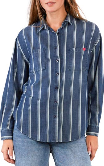 Crisp stripes delineate this collared, high-low boyfriend shirt cut from soft, breathable cotton-lyocell in a relaxed fit.