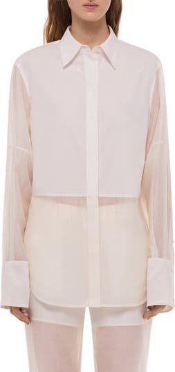 Sheer panels amplify the contemporary-chic style of this woven cotton shirt featuring a hidden-button placket.