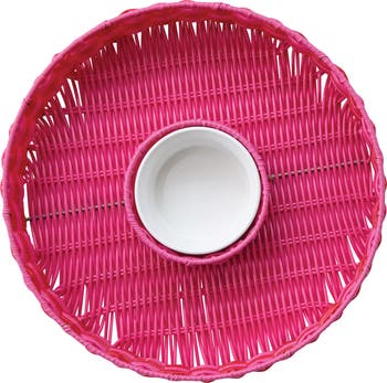 Add a festive touch to entertaining with this Woven Chip and Dip Basket, featuring a lively pink and red weave that brings warmth and whimsy to any table. The removable white ceramic bowl offers a clean contrast and holds up to 18 ounces of dip, making it perfect for serving chips, veggies, or fruit at casual gatherings. Ideal for Coastal, Beach, Cabin, Farmhouse, or Cottagecore settings, this round tray blends function with joyful design. Made of woven plastic and ceramic, it measures 13.25 inches in diameter and 3 inches in height. A charming way to serve snacks with style.