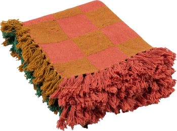 - A charming woven cotton blend throw featuring a two-tone checked pattern with fringe in multicolor