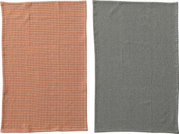 Add some color and charm to the kitchen with these woven cotton dobby tea towels. This set of two tea towels features a dobby weave that creates a subtle geometric pattern and adds texture and style. The contrasting orange and charcoal colors are vibrant and eye-catching, complementing any modern or rustic decor. These tea towels are soft, absorbent, and durable, making them ideal for drying dishes, wiping spills, or covering food. They also have a hanging loop for easy storage. Made of cotton, these tea towels are machine washable and tumble dry low for easy care and maintenance. Measuring 28 inches in length and 18 inches in width, these tea towels are generously sized to handle any kitchen task. Elevate every kitchen routine and dry dishes in style with this absorbent and beautifully designed tea towel.