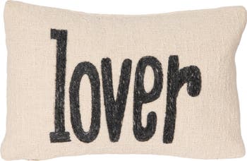 - A charming lumbar pillow featuring the word "lover" embroidered in elegant script