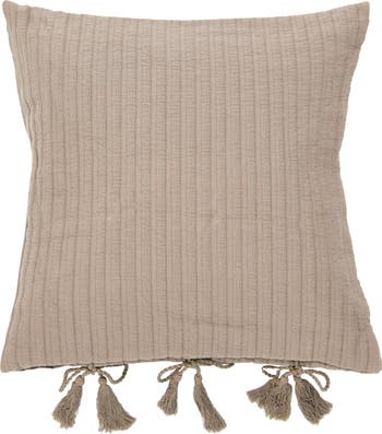 - Square grey cotton throw pillow with tassel ties; Tie closure