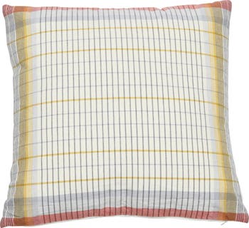 - Multicolor square cotton throw pillow with plaid print; White cotton encasement on back
