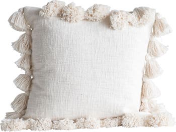 - A cozy and chic pillow with a woven cotton slub cover and tassels in a cream color