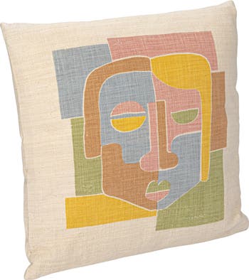 Woven Cotton Slub Printed Pillow with Abstract Face, Multicolor