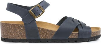These sandals feature a subtly wedged sole and two cross-over straps, secured with an adjustable ankle buckle for a refined fit. Their thoughtful design offers a natural, comfortable wear that complements a variety of outfits with understated sophistication.