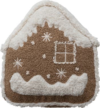 Add a touch of festive charm to any space with this whimsical Woven Fabric Bouclé Gingerbread House Shaped Pillow. Featuring embroidery in brown and natural colors, it is perfect for winter and Christmas decor. This playful pillow creates a warm and inviting atmosphere during holiday gatherings. Made from durable polyester for the cover and filler, it ensures a soft, durable, and visually appealing finish. Measuring 13 inches in length and 12 inches in width, this pillow brings warmth and holiday spirit to any setting.