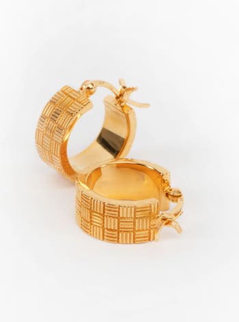 The baby to our medium Woven Bar Hoop earrings. The textural engraved detail of or signature motif makes these earrings stand out in the best way possible. These are fun pair to add to your collection.