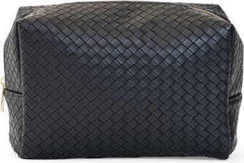 Perfect for everyday use, the Luxe Woven Everyday in Shell is a fresh take on our original woven—now updated with a brighter finish, and coordinating pinstripe interior. This zippered pouch is ideal for toiletries, cosmetics, and everything in between. Designed to stand on its own with an interior pocket for smaller needs, it’s both functional and beautiful—an elevated essential for any TRVL set. Woven Vegan Leather . Lined in stripe coordinate with clear overlay. Gold metal zipper. Stain resistant & wipeable inside and out.