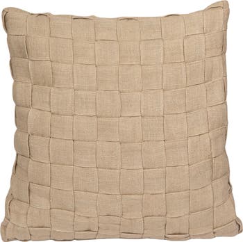 - A natural square pillow featuring a woven jute and cotton basket weave design