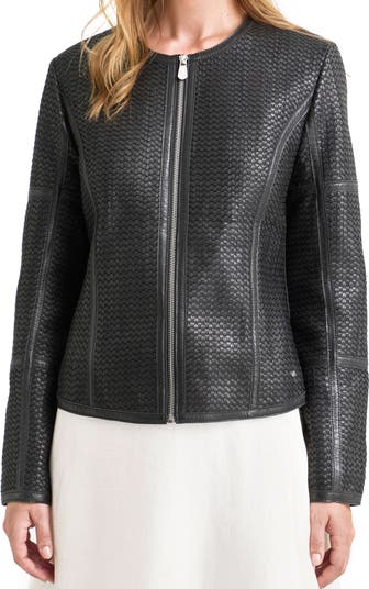 A leather woven jacket for women, featuring artisanal weaving and structural cuts to create an anatomically flexible silhouette.