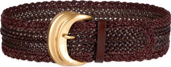 Add rich texture to any silhouette with this wide belt woven from smooth leather and raffia straw and finished with a sculpted buckle.