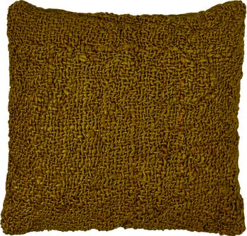 - Square chartreuse woven cotton and jute throw pillow; Tonal cotton encasement on back