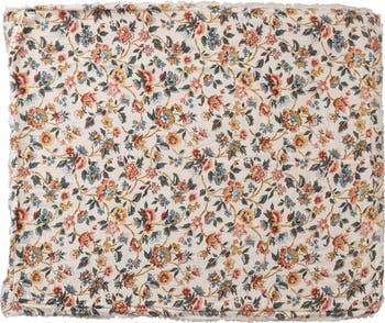 - A rectangular cotton throw featuring a vibrant floral print, soft backing, and playful fringe detailing
