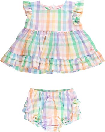 Woven Ruffle Sleeve Swing Top & Bloomer Set is the perfect addition to your little girl's wardrobe. This girls' clothing set features a swing top paired with coordinating plaid bloomers, both adorned with playful ruffles that add a touch of whimsy. The top includes a convenient half zipper, making it easy to dress your toddler. The lightweight and soft woven fabric ensures comfort, while the elastic waistband on the bloomers provides a snug fit. Ideal for casual wear, this set is unlined, offering a breathable feel perfect for playtime. Signature rear ruffles on the bloomers enhance the charm of this adorable outfit, ensuring your little one looks cute from every angle. The set combines style with practicality, equipped with full seat coverage to keep up with all her adventures.