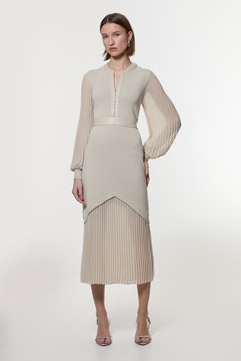 Elegant v-neckline with striking faux leather trim detail. Dramatic sheer pleated sleeves for a sophisticated silhouette. Flattering waistband with faux leather accent to define your figure. Distinctive layered design with pleated skirt section for added movement. Midi length perfect for versatile styling options. This Karen Millen woven dress masterfully combines structure and fluidity for a truly captivating occasion piece.