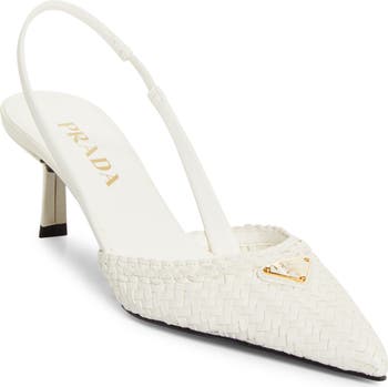A woven upper gives rich texture to a leather slingback sandal that sharpens ensembles with a pointy toe and slim heel.