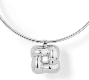A bold woven square motif glides along a structured collar necklace, offering an updated take on estate jewelry.