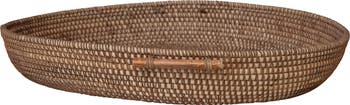- Made of handwoven natural rattan with integrated handles and a raised lip for secure placement