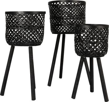 - A set of three elegantly woven wood baskets, each standing on sleek wooden legs in a striking black finish
