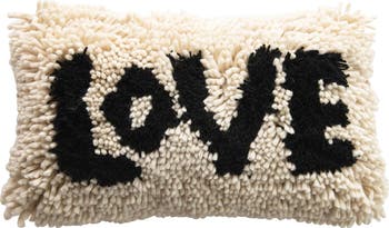 - A cozy and cute lumbar pillow with a woven wool shag design that spells "Love" in black on a cream background