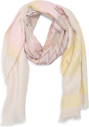 Lemon-yellow and pink highlight the faded zigzag stripes of this soft and lightweight scarf woven from cotton and modal and delicately edged with fringe.