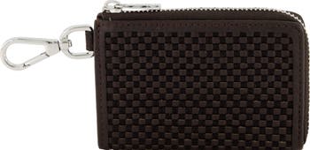 A secure zip closure ensures cards, cash and other forms of payment are safely stored within a woven card case made from smooth calfskin.