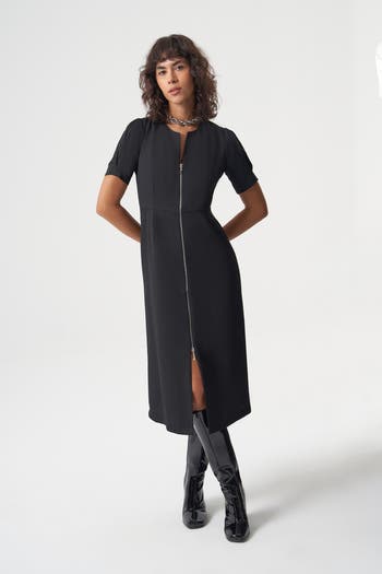 Woven Zipper Dress in Black color, perfect for dress. Height: 121 cm Bust: 96cm Waist:71cm Hips: 98 cm Sleeve Length: 26cm Collar:Cover collar Lining: Yes Accessory: Zipper Fit: Slim Fit Fabric Feature: 100% polyester Product Weight: 550 g