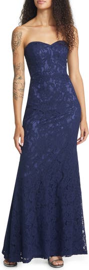 A strapless sweetheart neckline tops this elegant lace gown that flares out at the floor-sweeping hem.