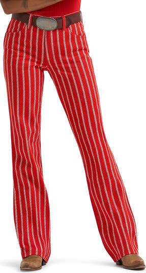 A Western rope print makes up the eye-catching stripes on these mid-rise bootcut jeans made from nonstretch denim in a bold red hue.