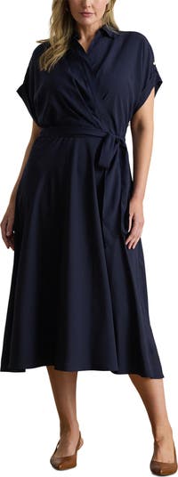 Desk days and drinks dates both work for a gracefully wrapped dress topped with a smart collar and offered in a versatile midi length.