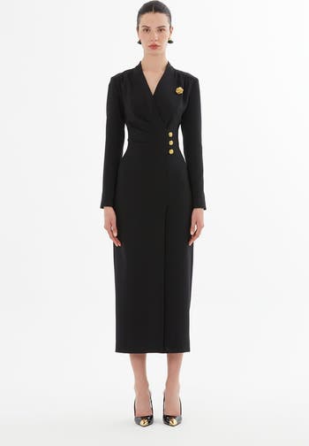 Made for Fall-Winter, this piece measures roughly 52 inches in length. It showcases a V-neck with long padded sleeves and a zippered, buttoned, double-breasted closure. The design has a standard size pattern, midi length, and slit style. It is pocketless and fully lined for comfort and insulation.
