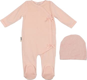 They'll be looking precious and feeling cozy in this ultrasoft velour footie featuring a wrap-front design and a matching beanie.