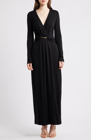A wrapped bodice and a banded waist shape the silhouette of this stretch-kissed maxi accented with golden hardware.
