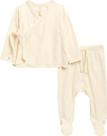 This long-sleeve wrap top crafted from stretchy organic cotton features an easy tie-side closure for a snug, comfy fit and coordinating drawstring footed pants for extended coziness.