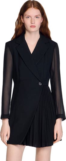 Tailored wraparound dress with long sleeves, a wide collar and an asymmetrical chiffon skirt with a pleated side. This item's main material is at least 50% recycled. Recycling reduces the environmental impact by limiting the use of virgin materials.