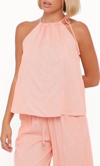 Cut from a breezy linen-kissed blend, this flowy sleeveless top is framed by cutaway shoulders and tethered with a dainty back tie.