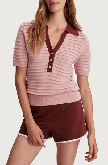 Sporty stripes are interspersed with lines of airy pointelle on this breathable cotton-blend polo-sweater that brings effortless style and sophistication to your game.
