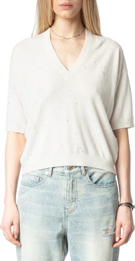 Elbow-length sleeves frame a slouchy sweater knit from a linen-and-cotton blend and strewn with a constellation of sparkling rhinestones to catch the light wherever you go.