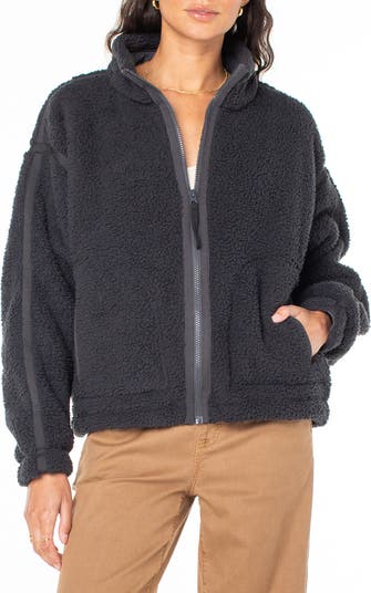 Stay warm on chilly days in this fluffy faux-shearling jacket framed by a cozy stand collar and slouchy sleeves.