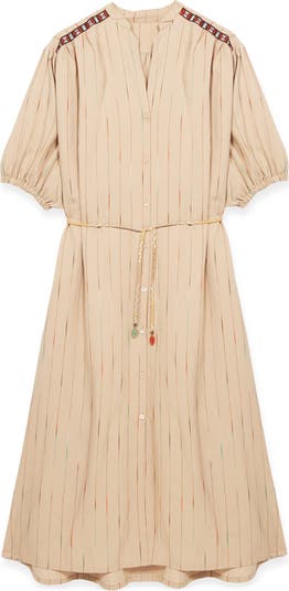 The Vera caftan dress features a striped pattern and a slightly oversized cut, perfect for warm days. With its Korean collar and mother-of-pearl button closure, it adds a touch of refinement. The 3/4 sleeves and back yoke complete the design with elegant details. Made in Italy from a light, breathable fabric produced by Manteco, composed of viscose, polyamide, and cotton. This Fortela dress ensures optimal comfort and freedom of movement.