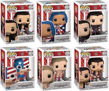 WWE Series 22 Funko Pop! Complete Set (6). Includes Dominik Mysterio, Zelina Vega, Seth Rollins w/Coat, Lex Luger (Summer Slam), Razor Ramon (Summer Slam), and Mr. America.