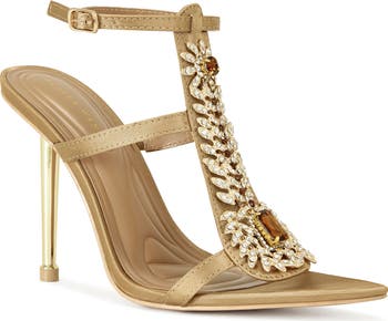 Sparkling crystals highlight the delicate leaf designs of an ankle-strap sandal lifted by a gleaming stiletto heel.