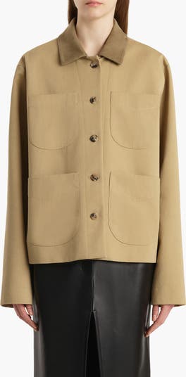 Khaite brings a tailored verve to the traditional chore coat in this hand-finished style, crafted from water-repellent cotton gabardine selected for its washed look and natural feel. Uniform-inspired topstitching highlights the four riveted patch pockets and subtly coordinates with the suede collar.