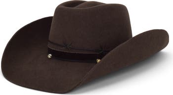 Every curve of this felt Western silhouette takes on new dimension when the crown is cinched by a silk-kissed velvet band adorned with spotted stones and flickers of biot feathers. Handcrafted attention to detail delivers depth and shine for a collectible piece you’ll reach for again and again.