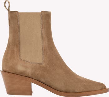 Crafted from supple suede, Wylie is a pointed-toe fitted Chelsea bootie with a 55mm Western heel. The design presents tonal elastic inserts on both sides for easy wearability. Handmade in Italy.
