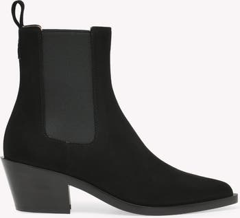 Wylie is a pointed-toe Western bootie with a 55mm heel and two tonal elastic side inserts. Handmade in Italy.