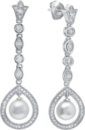 Milgrain settings house multicut cubic zirconia and halo pavé in these drop earrings anchored by cultured pearls.